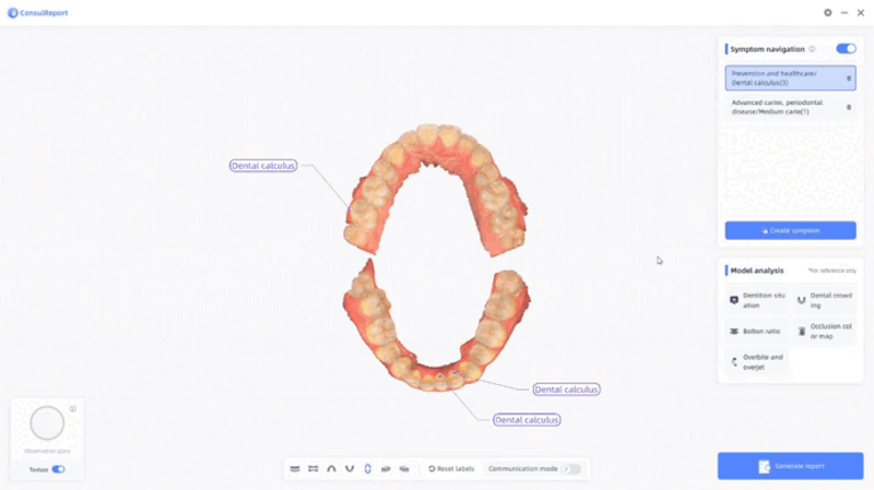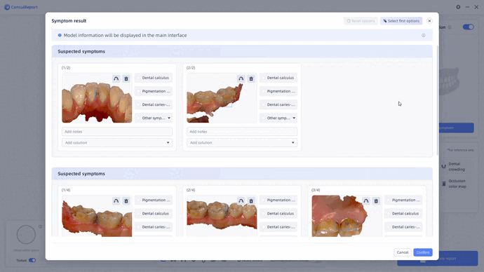 The AI function can only distinguish the most common 3 kinds of diseases: caries, pigmentation and calculus, whereas users can add others in the symptom edition stage.