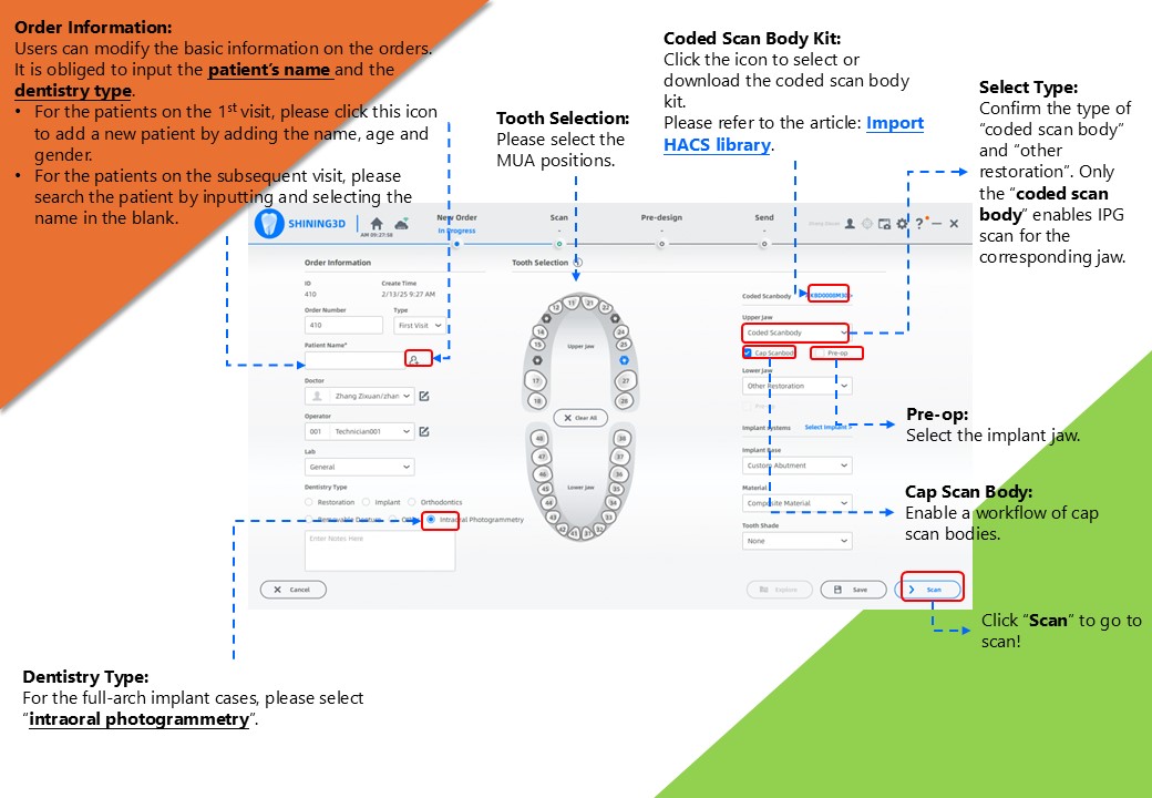 Attention: From V3.5.6.6, the intraoral photogrammetry is independent from the implant dentistry type. Users should select the intraoral photogrammetry to enable the workflow of full-arch implant cases. We also added the workflow of cap scan bodies, you can refer to the article: Cap Scan Body.