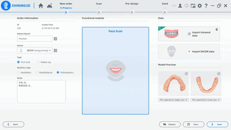 The new version adds 3D preview of intraoral scan data in the order creation interface. After importing the intraoral data, the upper and lower jaw models display both occlusal surfaces by default. Users can manipulate the model by clicking to rotate, using the sliding wheel for scaling, moving the cursor while holding down the left and right mouse buttons for translation, and finally clicking the “Fit View” button in the top right corner of the “Model Preview” to reset the model to its initial state. If there are multiple sets of models, users can select the pre-operative jaw, common jaw, or implant jaw from the drop-down list. The priority for displaying these models in the alignment interface is pre-operative > common > implant.