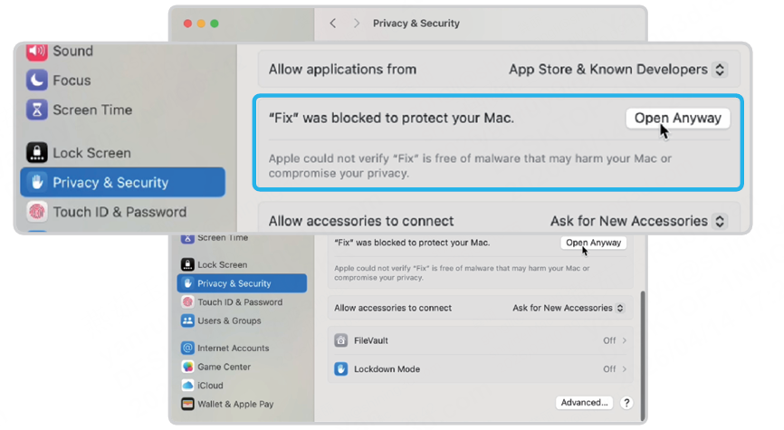 3. In System Settings, go to Privacy & Security, scroll down, find the message “Fix was blocked to protect your Mac”, and click Open Anyway.
