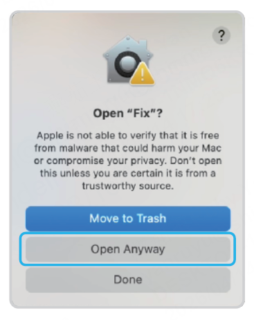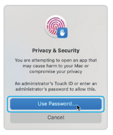 4. In the confirmation dialog that appears, click Open Anyway again and then enter your system password.
