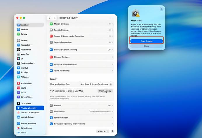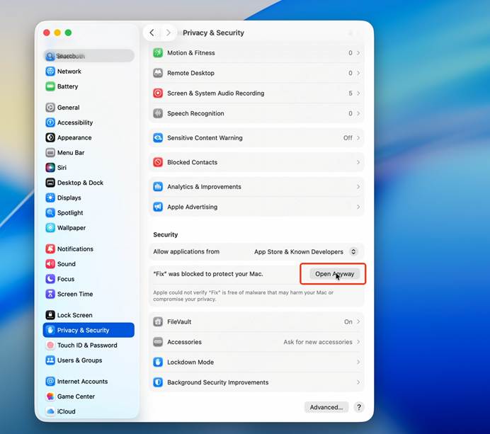 3. In System Settings, go to Privacy & Security, scroll down, find the message “Fix was blocked to protect your Mac”, and click Open Anyway.