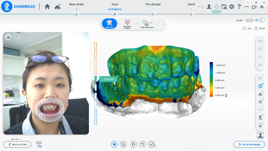 After the patient is properly fitted with the retractor or tracker and Marker Recognition is completed, capture facial data in the intercuspal position to record the markers' positions on the teeth and ensure alignment with the intraoral scan data.