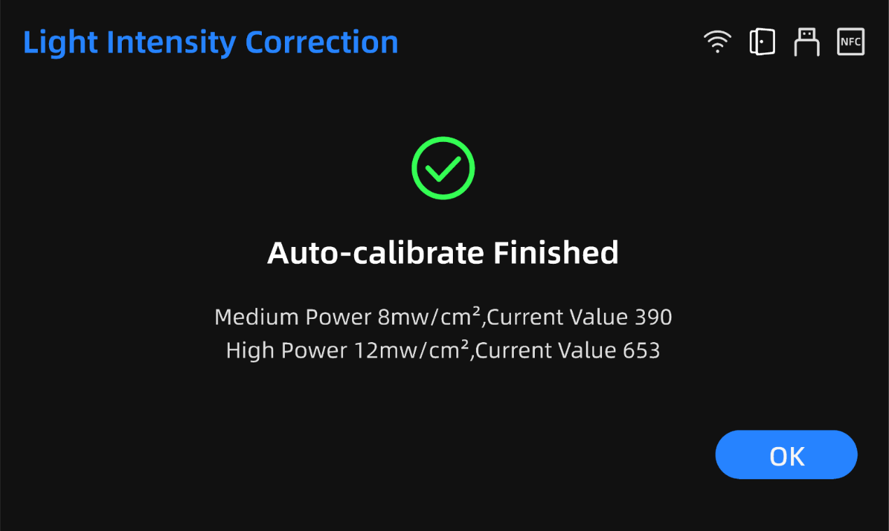 - After calibration is complete, the result page is displayed. Click OK on the result page to exit the light intensity calibration process.