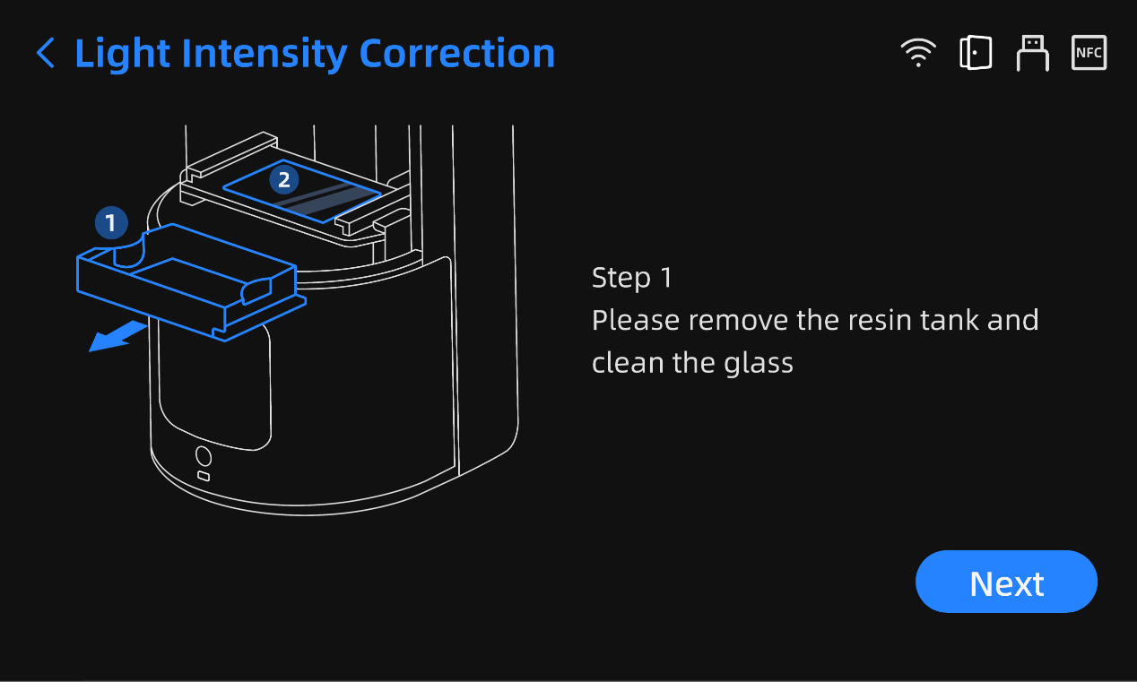 - Step 1: Refer to the guide image, remove the resin tank, and clean the screen thoroughly. Then click Next.