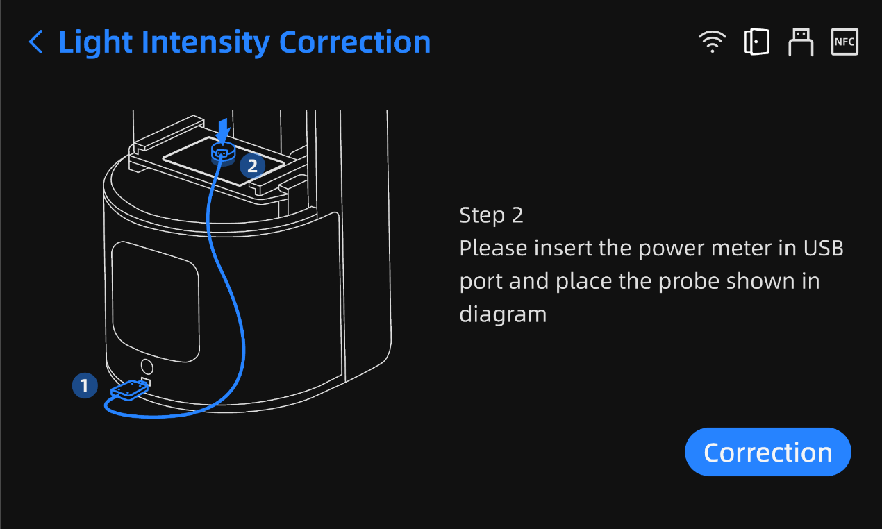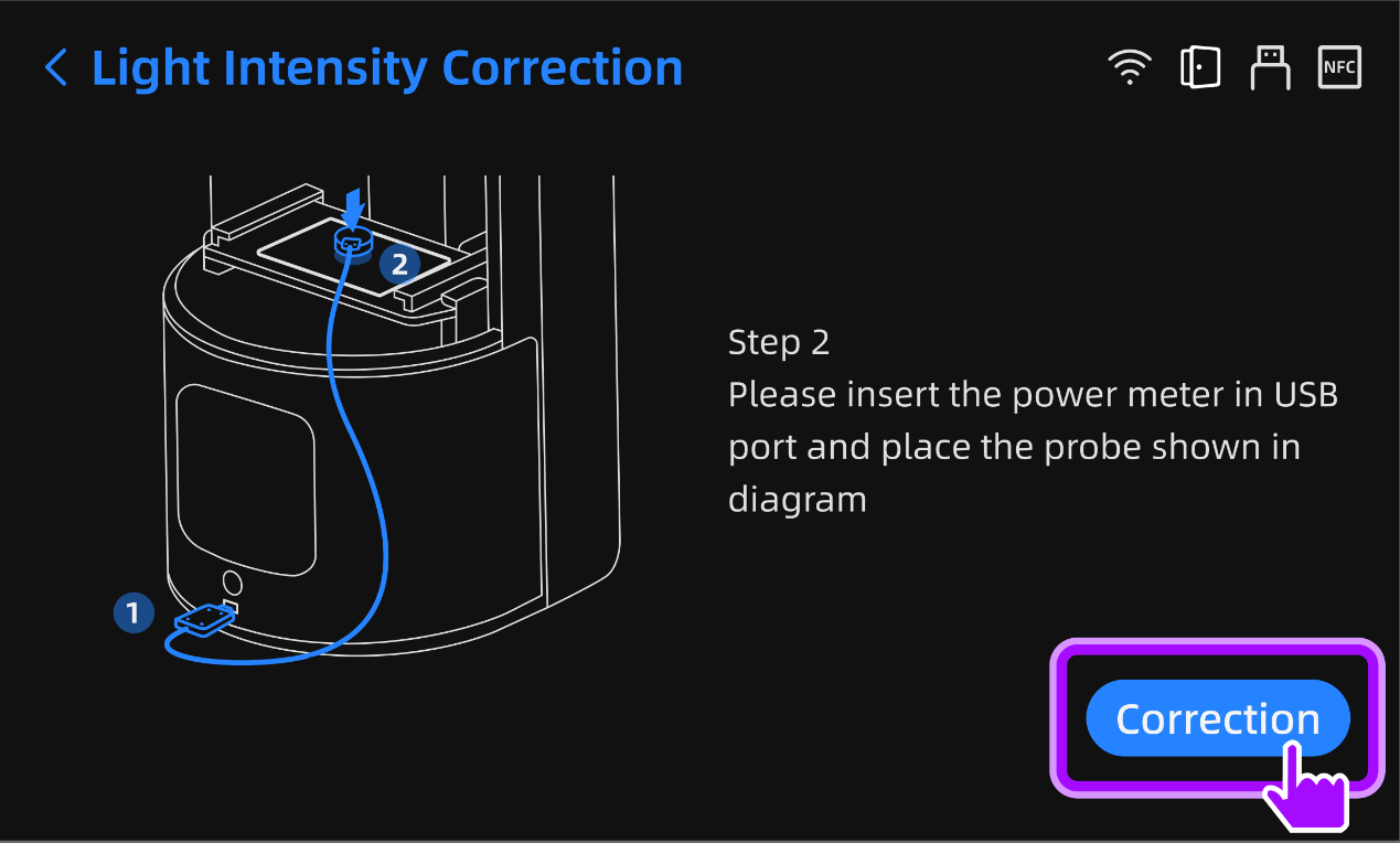 a. Insert the optical power meter into the USB port located on the front of the printer, below the software screen (Correction can't start if it's not inserted)