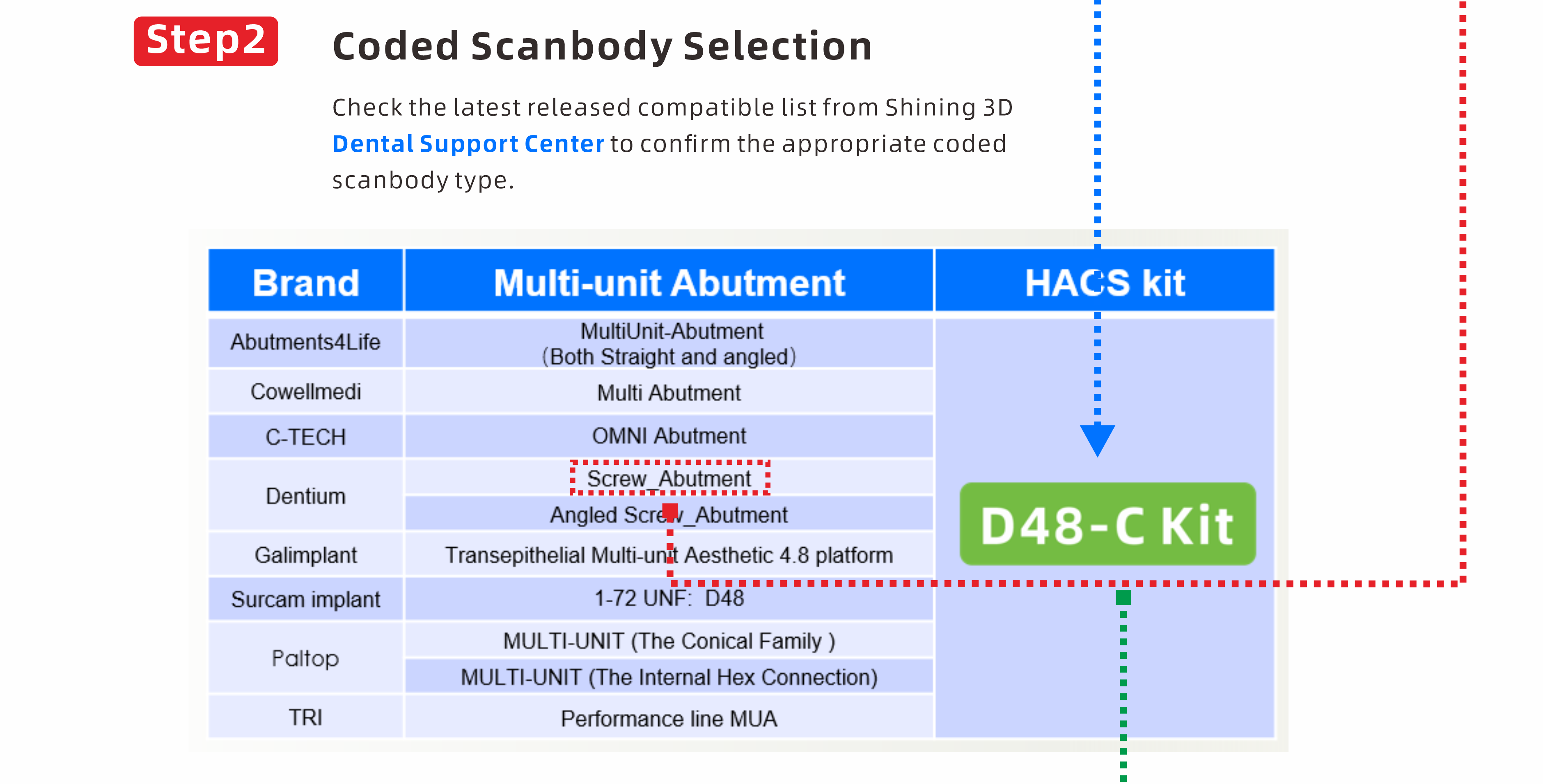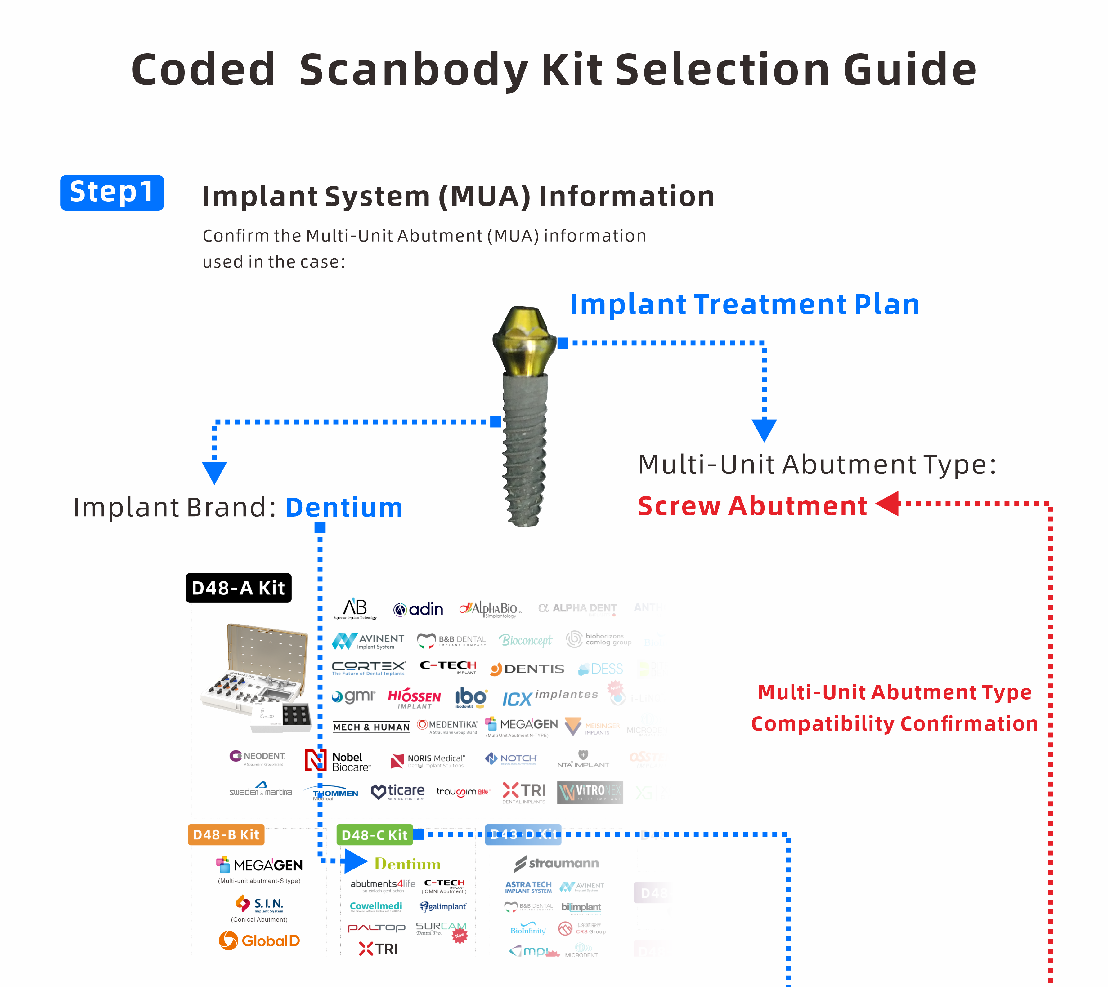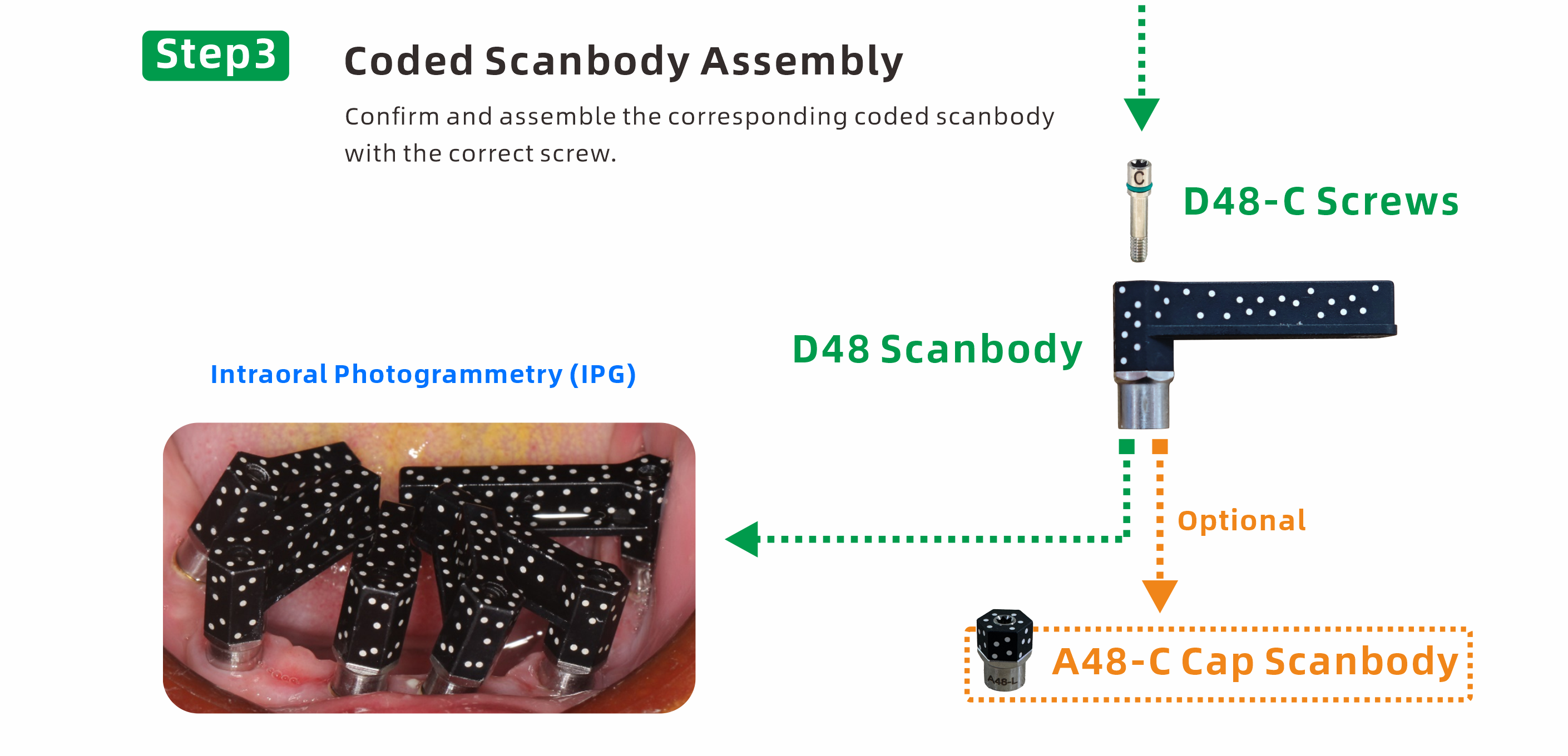 Based on the implant and multi-unit abutment information defined in the treatment plan of the specific scanning case, follow the steps below to assemble the corresponding coded scan body to ensure accurate and successful scanning.