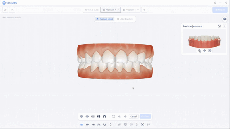 Haga clic en el diente objetivo y modifique las áreas con el pincel o el borrador. Arrastre el cursor para aumentar o reducir el área y haga clic en “confirm” para finalizar la modificación.