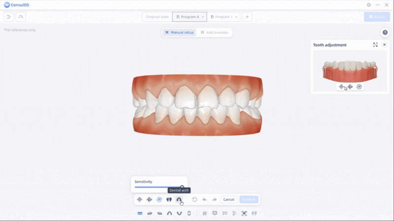 Dental Arch: Arrastrar la barra de umbral para ajustar el ancho y largo del arco y la inclinación labial de los dientes anteriores superiores.