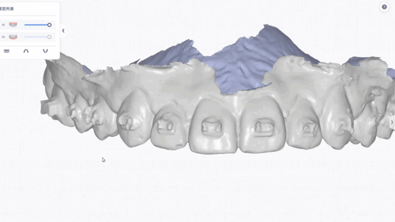 Después de activar el módulo Cresplint y realizar los preajustes, los usuarios pueden ingresar a la preparación del modelo. Pueden utilizar las herramientas de esculpido ubicadas en el lado derecho para modificar la superficie de los dientes. La intensidad y el tamaño del pincel se pueden ajustar moviendo el cursor en la barra.