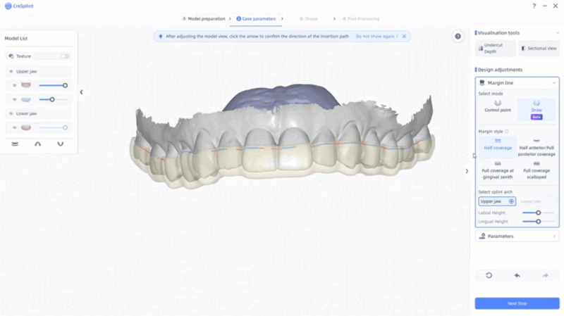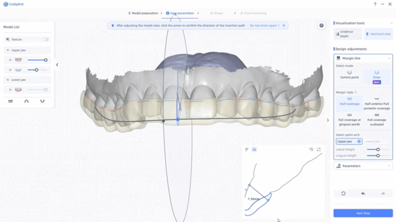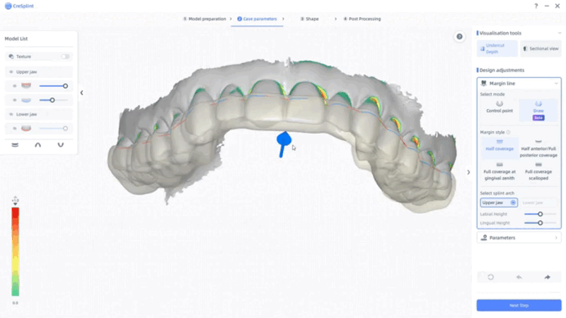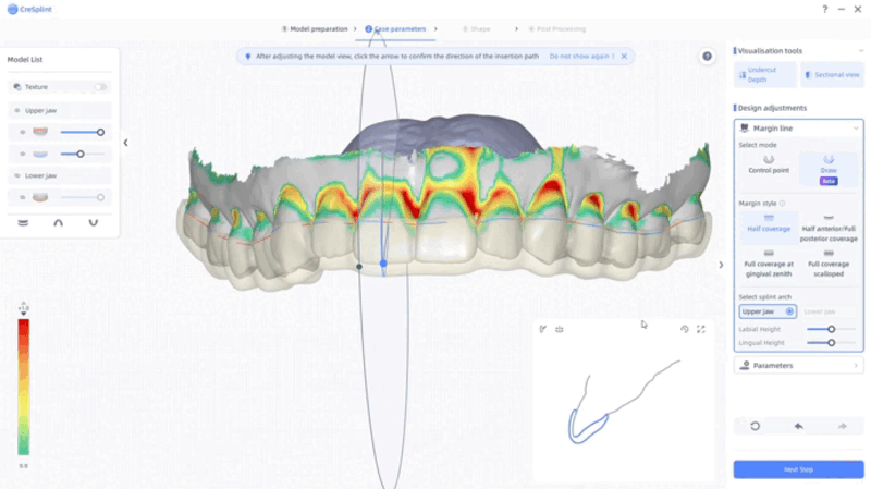 La herramienta de socavado representa visualmente la banda de socavados mediante colores distintivos, lo que permite identificar claramente su distribución. La trayectoria de inserción se define siguiendo el principio de minimizar los socavados, con el objetivo de distribuirlos de la forma más uniforme posible.