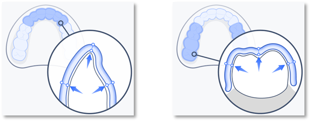 En el caso de los retenedores, el espesor de los dientes anteriores y posteriores puede ajustarse de forma individual. Generalmente, el espesor de los dientes anteriores es mayor que el de los posteriores. Además, se establece un espesor mínimo estándar de 0,6 mm.