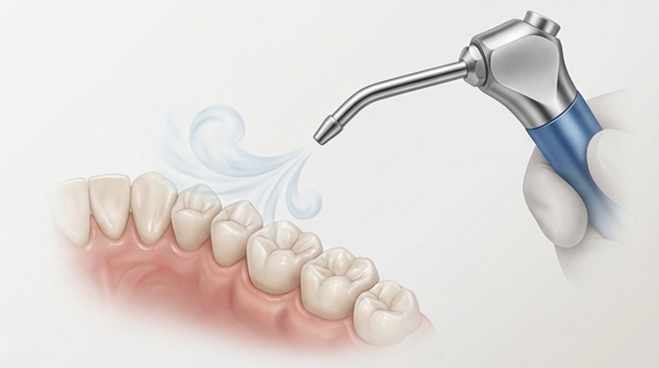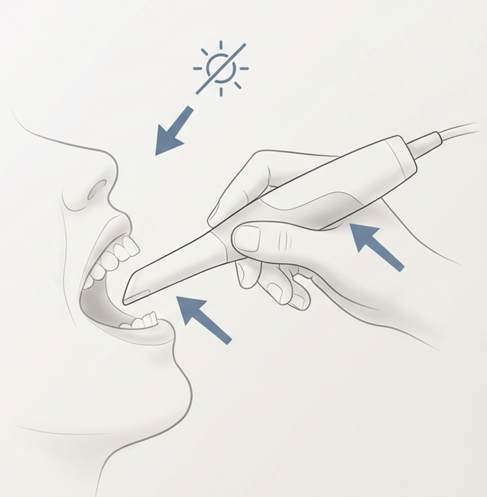 Segure o scanner com firmeza, mantendo a ponta estável e próxima aos dentes, sem compressão excessiva de tecidos.