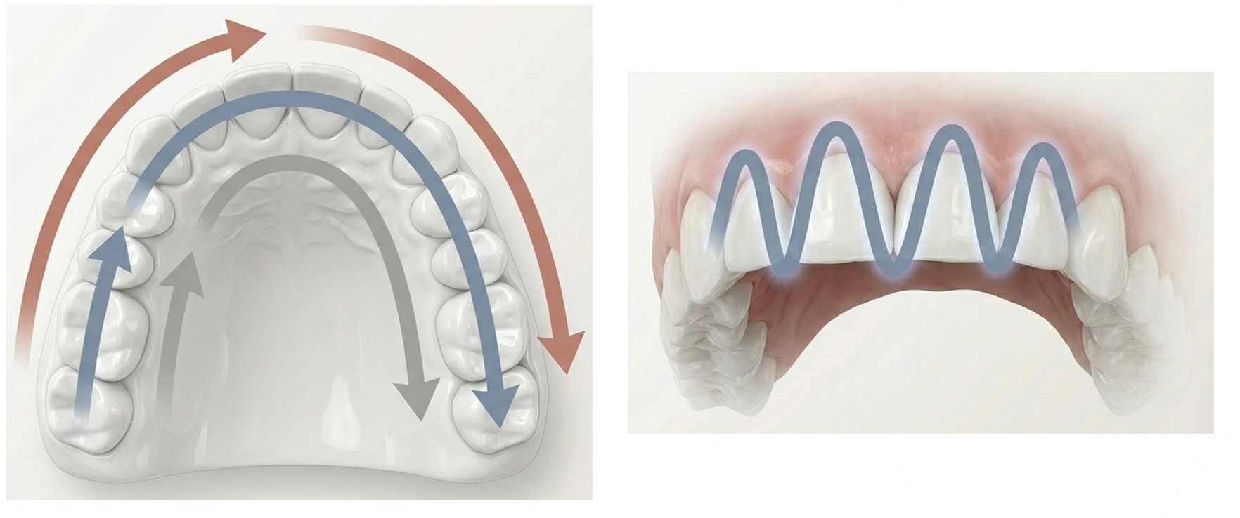 Ao chegar nos dentes anteriores, movimente o scanner suavemente em movimento de gangorra, permitindo capturar todas as faces incisais e transições.