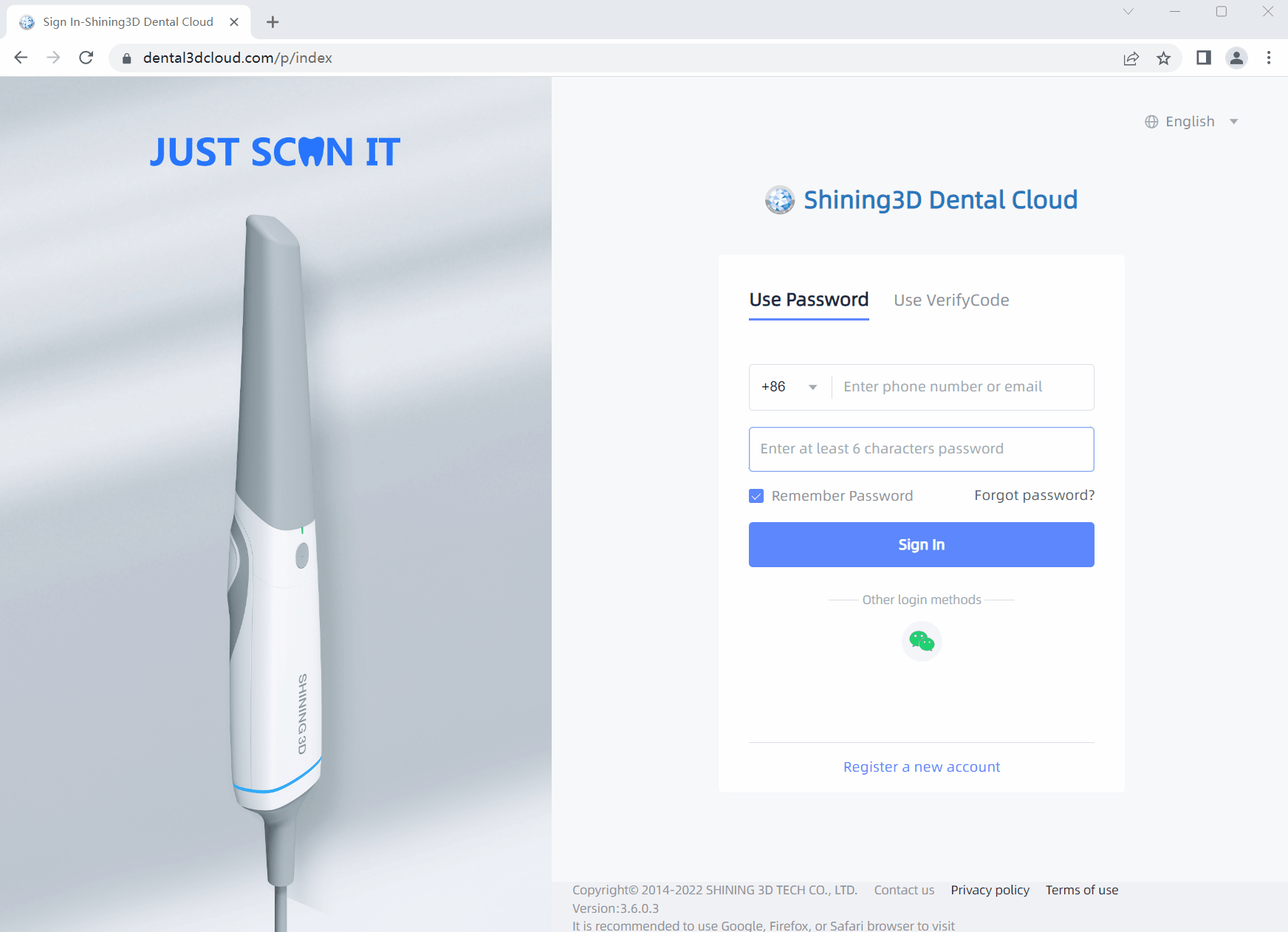 - Navegue para https://www.detal3dcloud.com/ pelo seu navegador. Preencha o campo com o ID da sua conta, que pode ser seu e-mail ou seu número de celular - usados para o registro na Nuvem Shining 3D.
