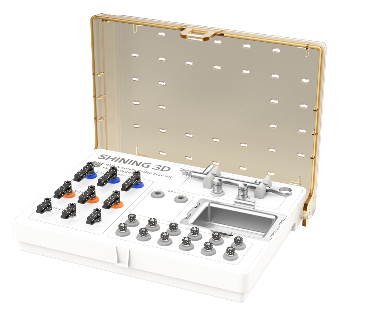 O kit é fornecido em um estojo cinza e reúne os itens necessários para o fluxo de escaneamento com implantes.