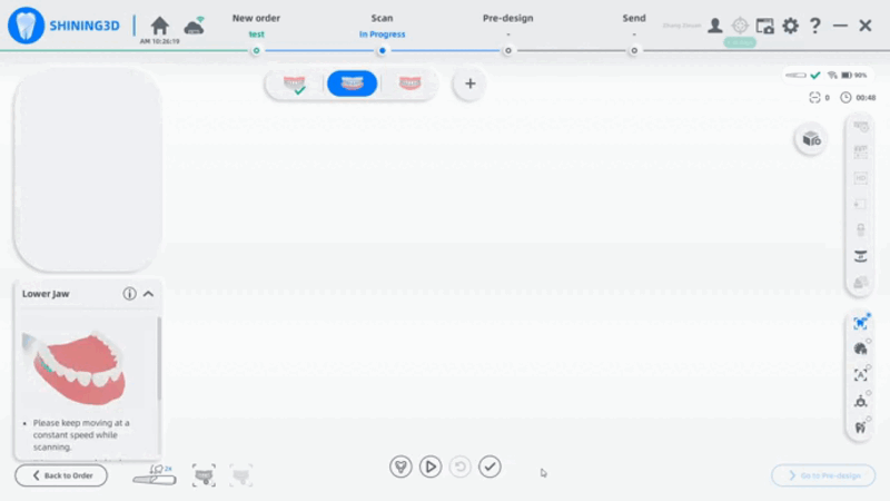 No menu Settings > Scan Settings > General, a função Refined Scan vem ativada por padrão, permitindo que o recurso seja acionado automaticamente após o escaneamento de arcadas únicas. Caso a função esteja desativada, o usuário ainda pode acessar o processo de forma manual.