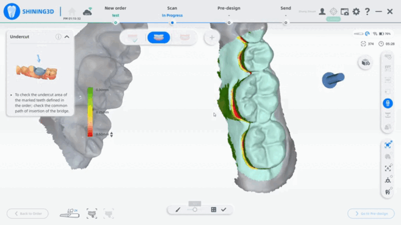 As áreas reteintivas podem ser calculadas e verificadas após o escaneamento das áreas correspondentes clicando no botão “retenção”. Selecione uma área alvo com o pincel. O mapa de áreas retentivas será gerado automaticamente. Mova o cursor para mostrar os valores específicos nessa área.