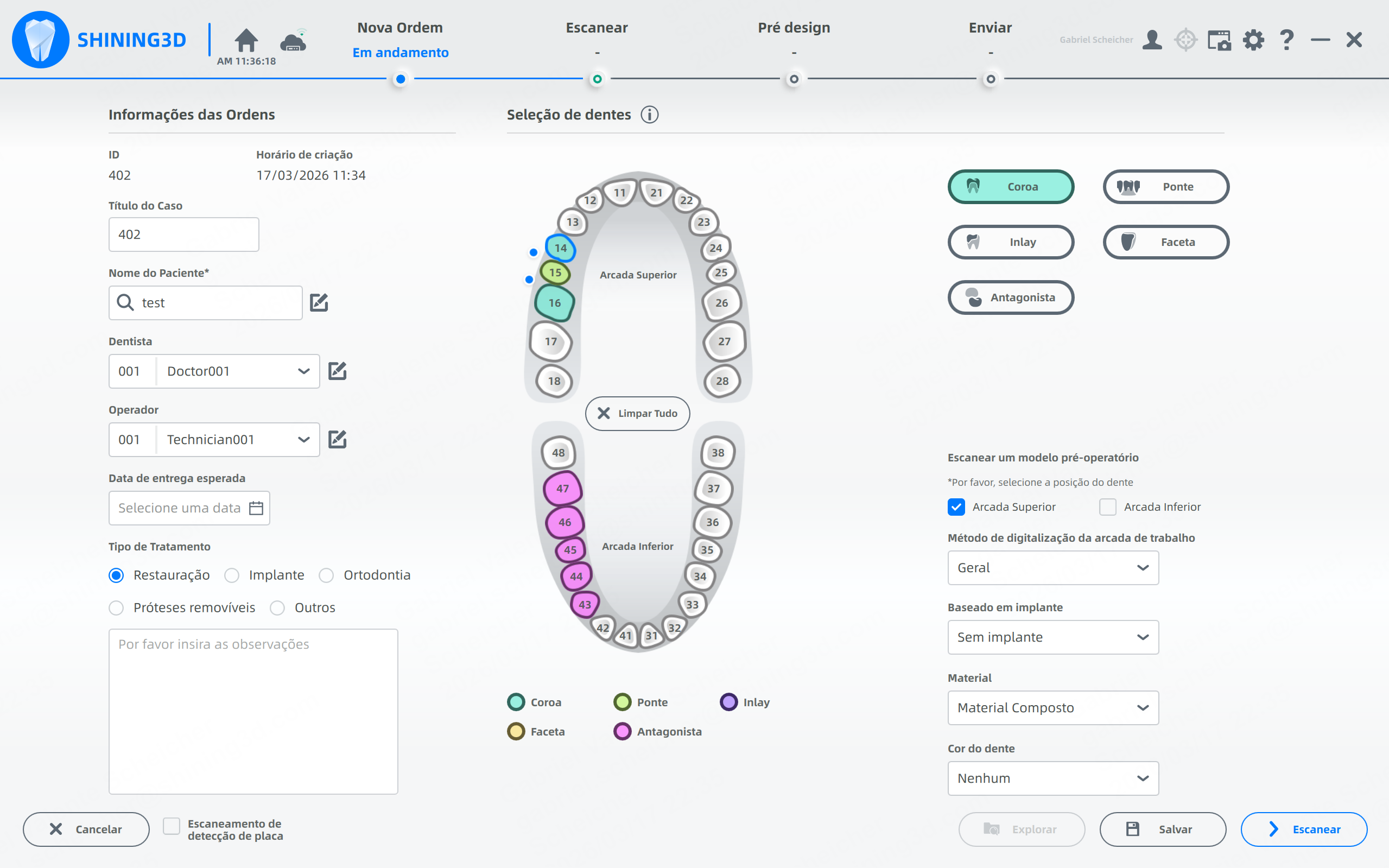 Neste exemplo, foram selecionados duas coroas nas regiões 14 e 16, com um pôntico na região do dente 15, ativando a opção de Pré-operatório.
