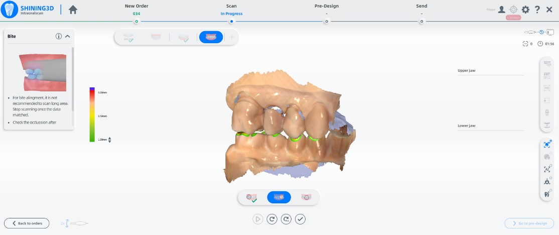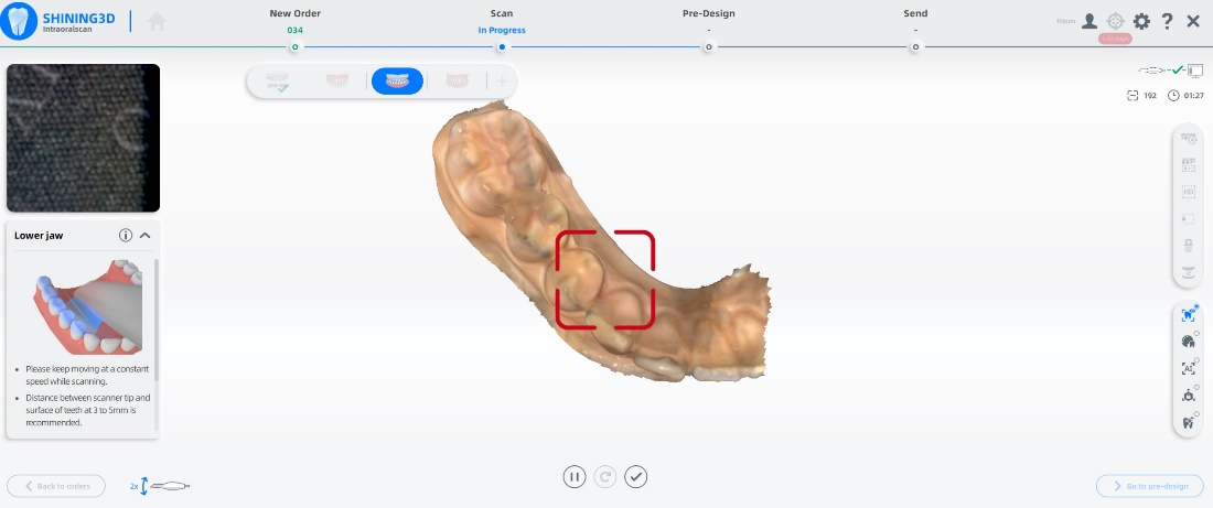 Para obter o melhor resultado, inicie o escaneamento a partir de uma área que não foi previamente apagada, garantindo que o software consiga alinhar corretamente os preparos com as demais aquisições.