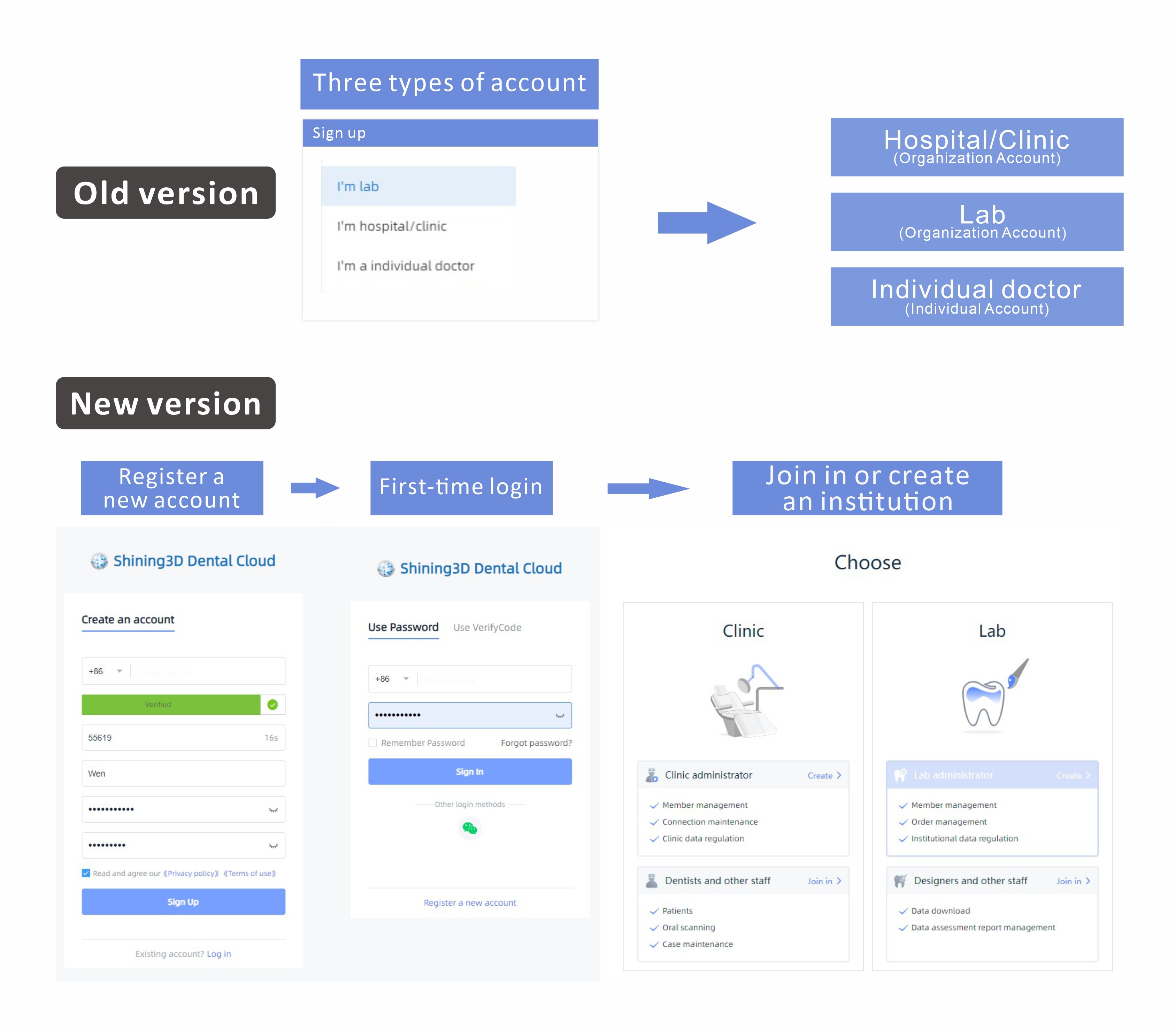 Вы найдете различия в создании учетной записи, а также в ролях и определении между новой и старой версией Shining3D Cloud. Некоторые изменения были сделаны для того, чтобы улучшить пользовательский опыт, а также безопасность данных.